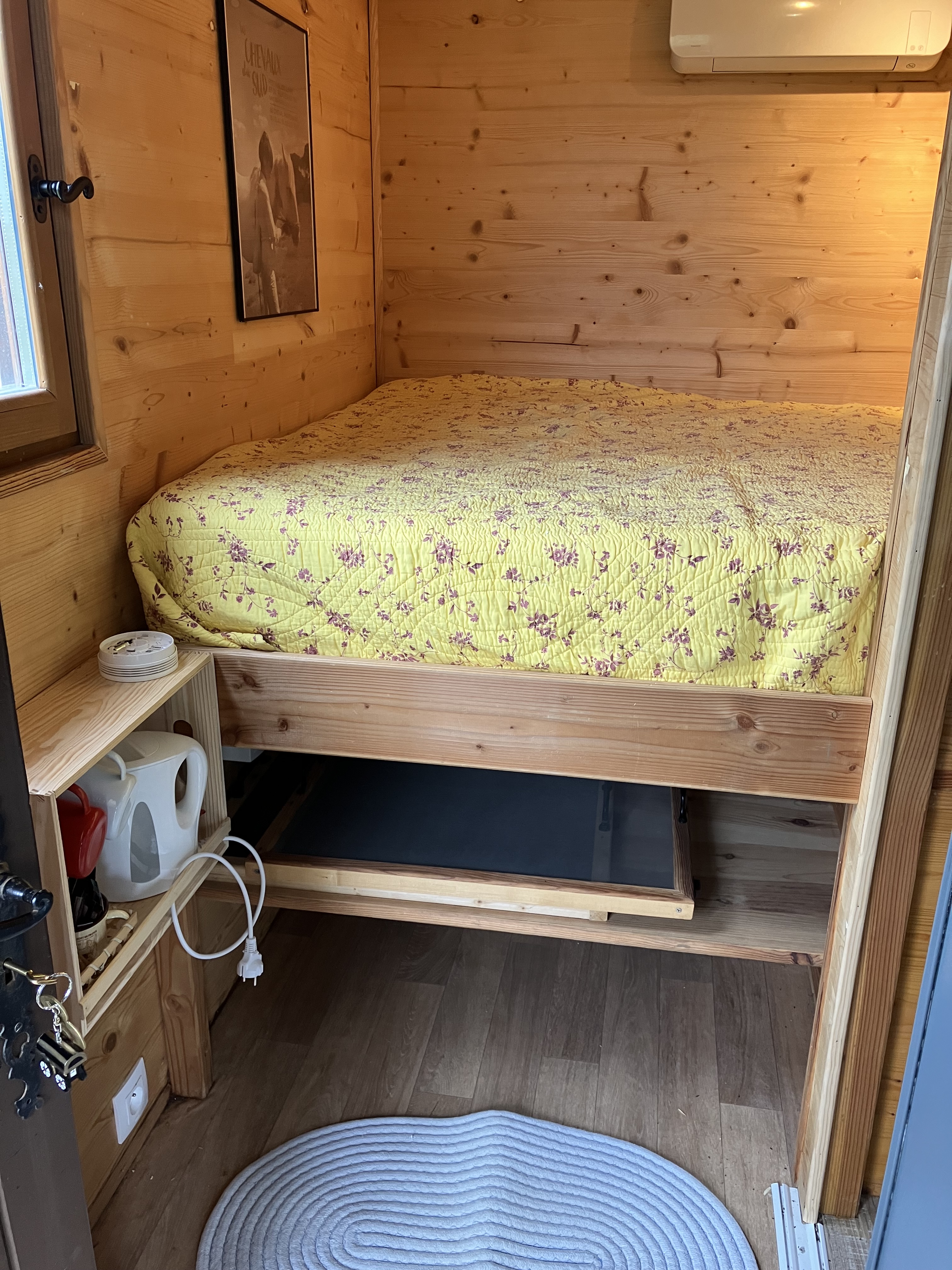 La petite roulotte est pour deux personne. C’est un hébergement TOUT PETIT (style cabine de 6m2)