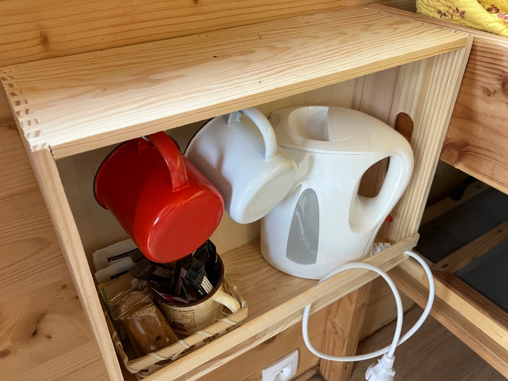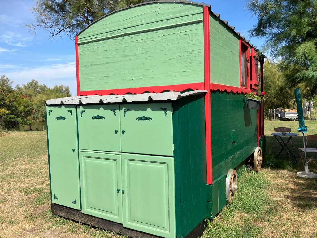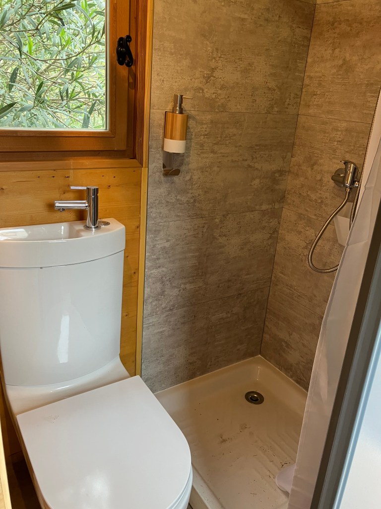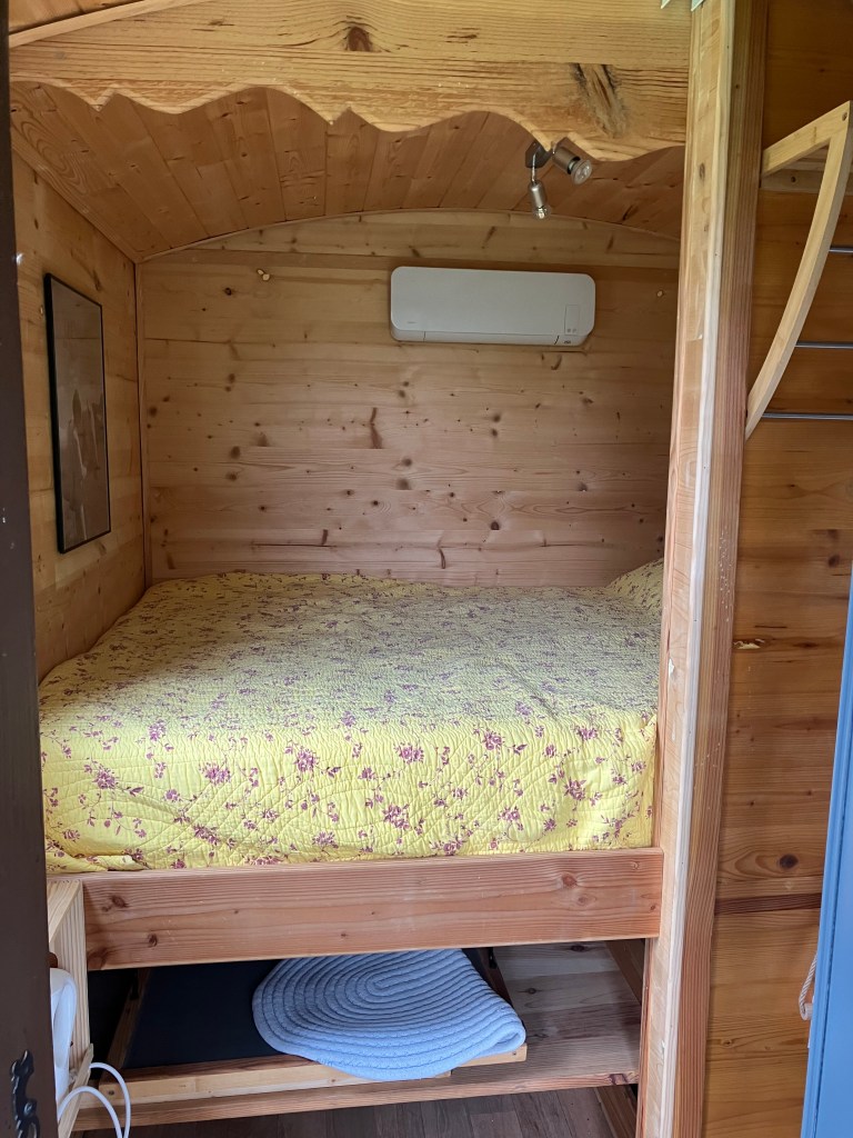 La petite roulotte est équipée d’un lit en 140, et une salle d’eau avec douche, WC et lavabo.