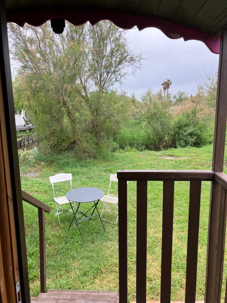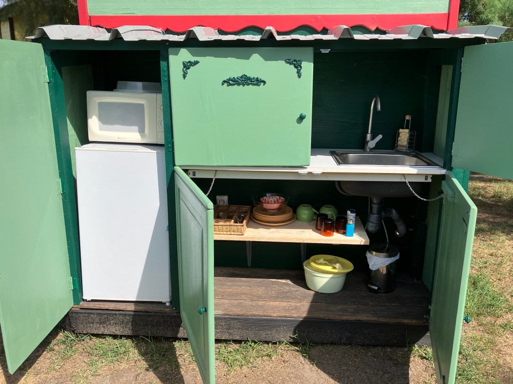 À l’extérieur tables et chaises de jardin et un petit coin cuisine avec frigo, micro-ondes et un peu de vaisselle.